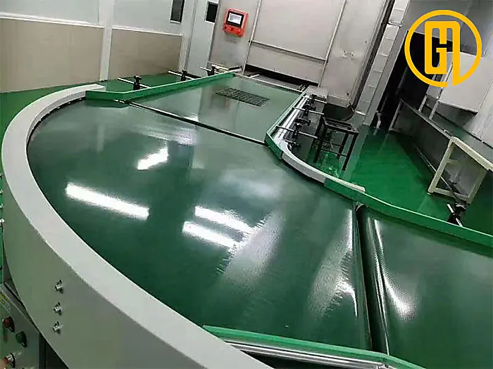 Dây băng tải cong: Sử dụng vật liệu PVC hoặc PU chất lượng cao, có độ bền và khả năng chịu mài mòn tốt, phù hợp với nhiều loại sản phẩm.