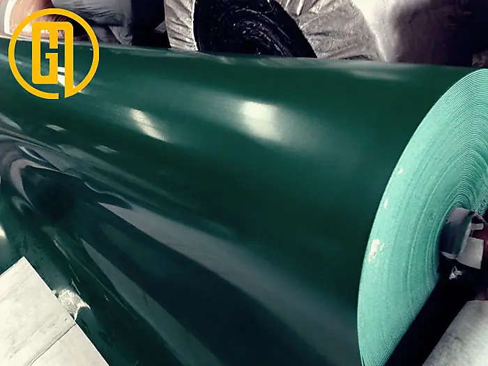 PVC xanh: Mặt trên trơn bóng – mặt dưới lớp bố vải, độ dày 1, 2, 3, 4, 5 mm