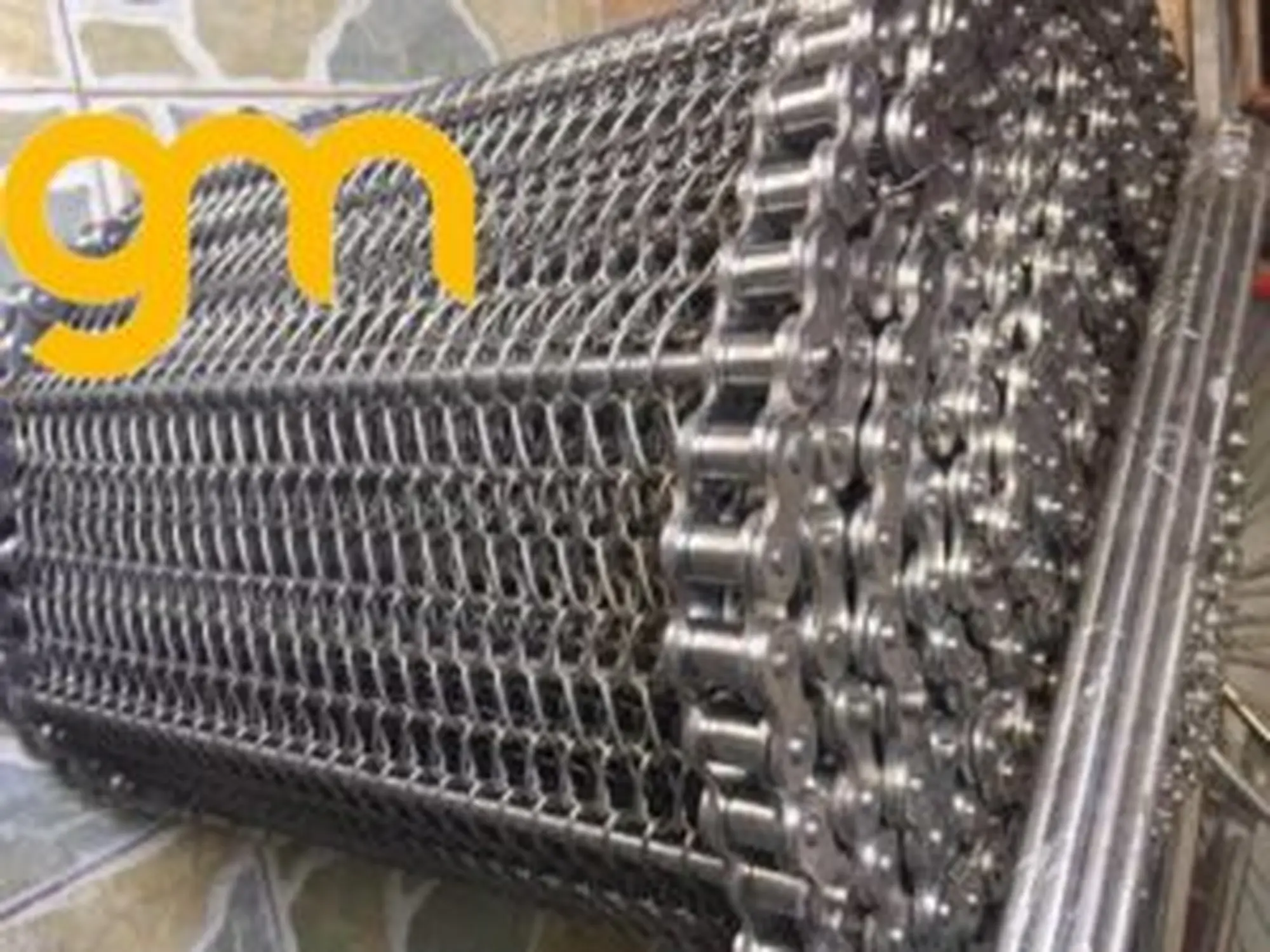 Để cho lưới băng tải không bị biến dạng, xô lệch chúng tôi gắn thêm 2 xích chịu lực 2 bên lưới băng tải inox để chống mài mòn. Kết hợp với ty tăng cứng nối ngang bằng vật liệu inox.