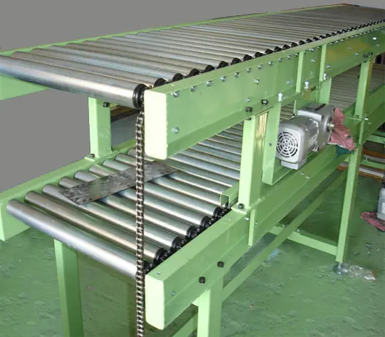 - Băng tải con lăn xích thường dùng trong các kho hàng, với tính năng gọn nhẹ và thuận tiện cho việc di chuyển.